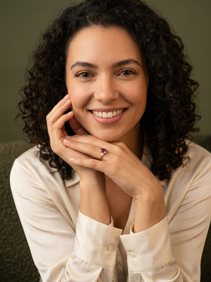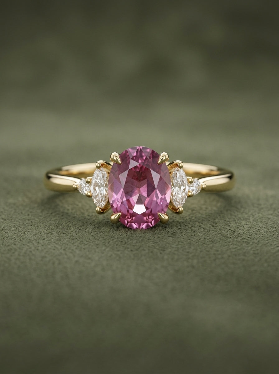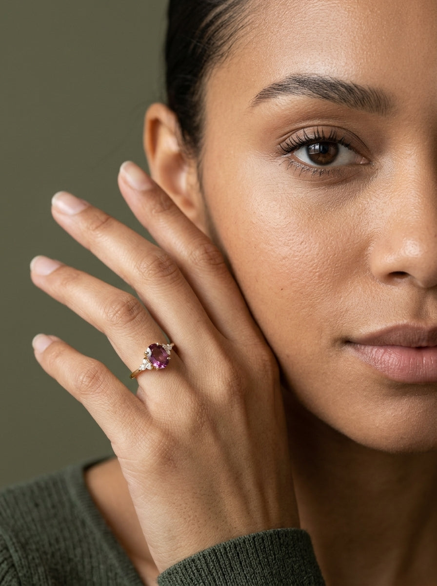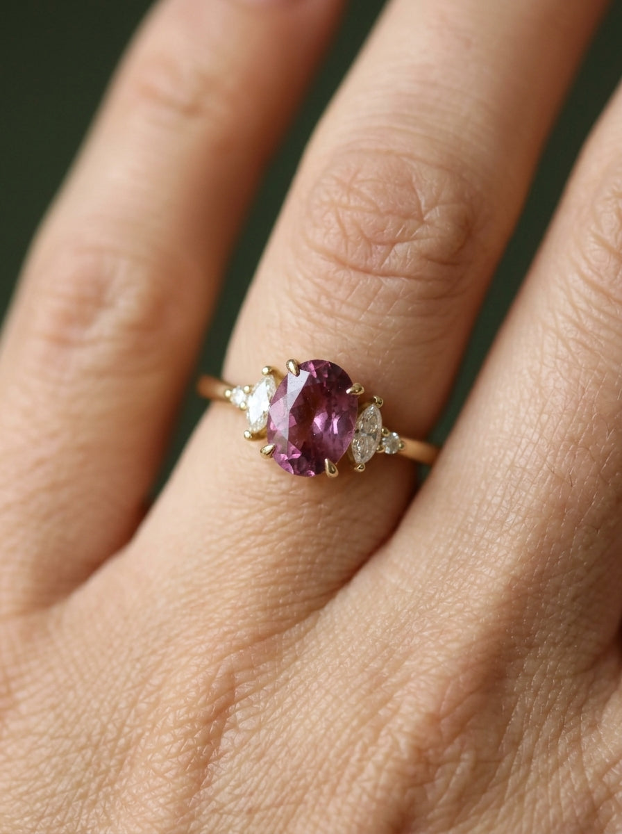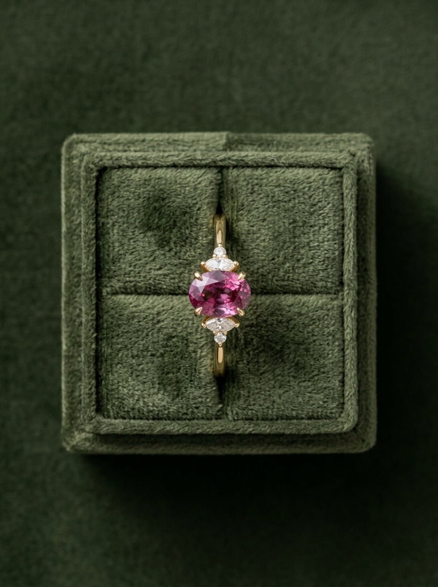 Nuestro anillo ivy ring es de oro 14k con un grante pyrope de 1.38ct con diamantes de laboratorio corte marquisse y redondos